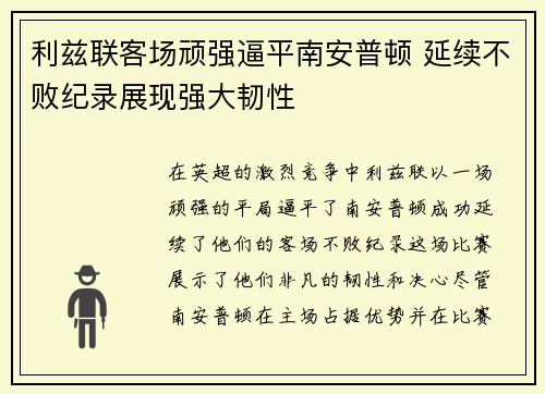 在英超的激烈竞争中,利兹联以一场顽强的平局逼平了南安普顿,成功延续了他们的客场不败纪录,这场比赛展示了他们非凡的韧性和决心。尽管南安普顿在主场占据优势并在比赛中表现强势,利兹联依然能够从困境中找到反击的机会,并在比赛末期扳平比分,最终以1-1结束比赛。这场比赛不仅延续了他们的良好状态,还为他们的未来征程注入了强大的信心和动力。本文将从四个方面详细分析利兹联如何在客场顽强逼平南安普顿,延续不败纪录并展示出强大的韧性。