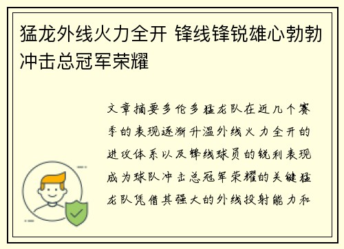 文章摘要:多伦多猛龙队在近几个赛季的表现...