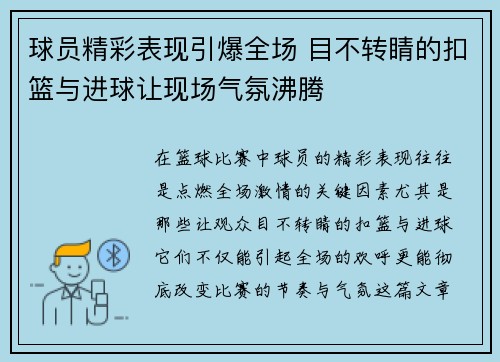 在篮球比赛中,球员的精彩表现往往是点燃全...