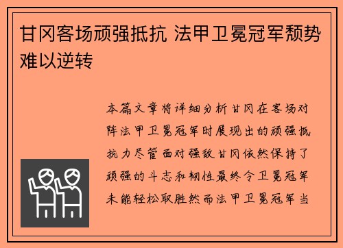 本篇文章将详细分析甘冈在客场对阵法甲卫冕...