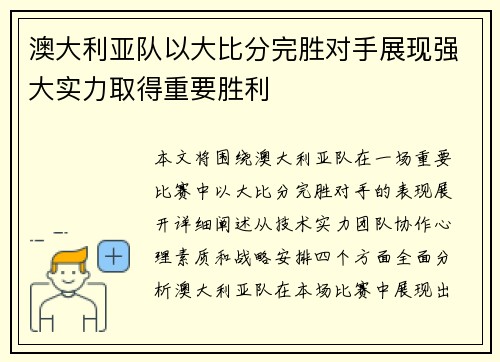 本文将围绕澳大利亚队在一场重要比赛中以大...
