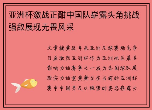 文章摘要:近年来,亚洲足球赛场竞争日益激...