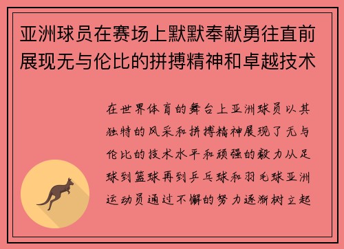 在世界体育的舞台上,亚洲球员以其独特的风...